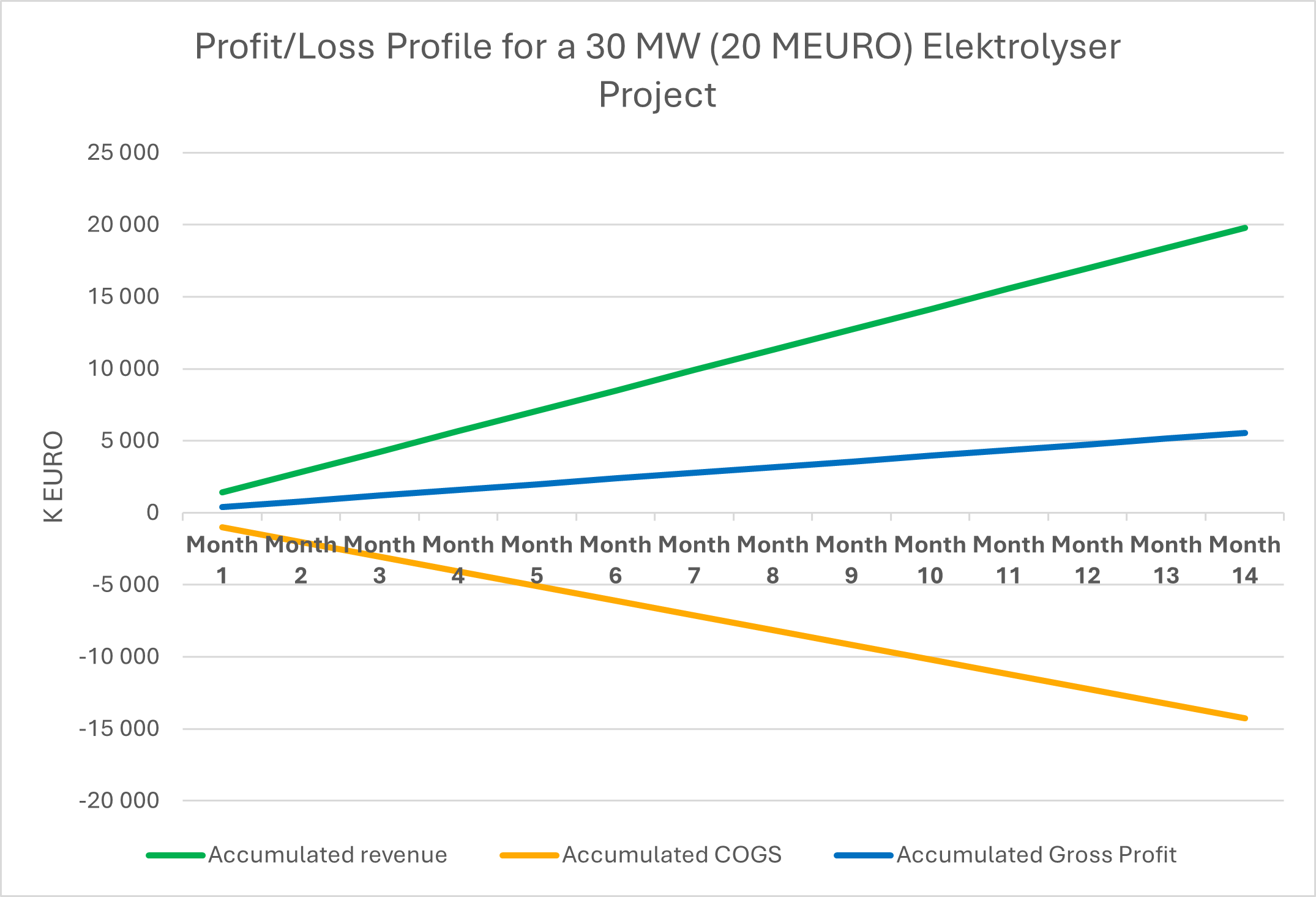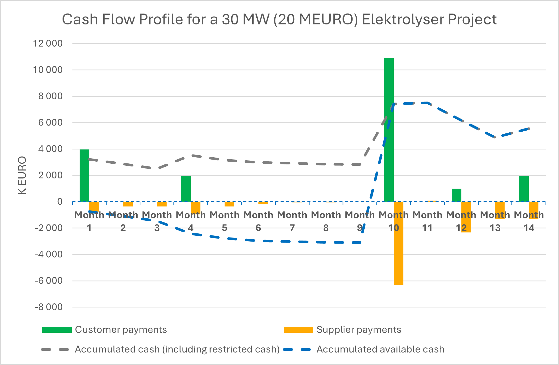 Produktionskostnaden kommer att betalas ut successivt under hela projektperioden, vilket genererar ett negativt ackumulerat kassaflöde fram till sommaren 2025 då de 16,8 miljoner euro i kundbetalningar är frigjorda och tillgängliga.